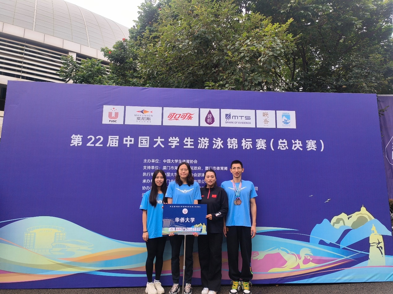 12月3日-6日,在厦门海沧进行的第22届中国大学生游泳锦标赛(总决赛)中,我校运动训练专业2023级陈宜郡同学获得丁组50米、100米仰泳冠军,2022级蔡宏伟同学获得丁组100米蝶泳亚军、200米蝶泳季军,2023级李然同学获得丙组400米混合泳亚军。教练仇婷婷老师获得总决赛优秀教练员称号。