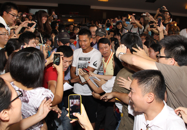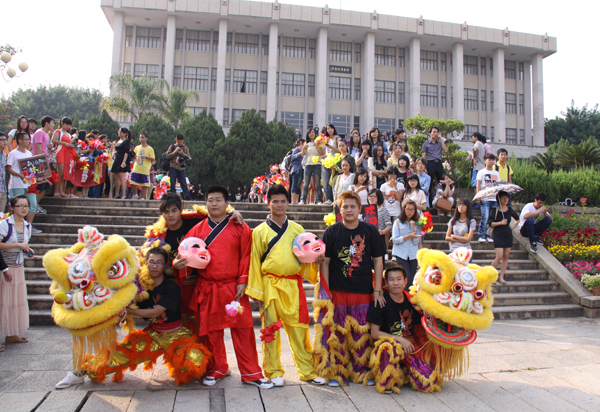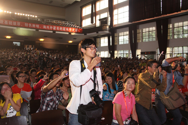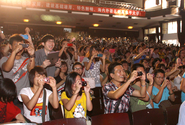 随着洪亮的二十四节令鼓声响起,“超级丹”林丹和“外战女皇”汪鑫终于出现了。纪念堂外的气氛瞬间被同学们点燃,在工作人员的簇拥下,两位奥运健儿缓缓地“挤”入会场。会场内顿时响起了响亮且持久的欢呼声,国际贸易管理专业2011级傅张旭同学说:“第一次离世界冠军这么近,看到他仿佛又看到那天大家簇在电视机前看羽毛球比赛决赛,为他呐喊。”