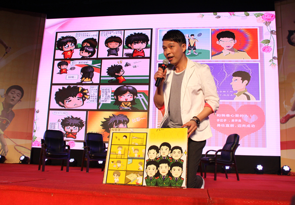 泉州电视台著名主持人、太阳集团网tyc9728校友沈昊翔展示美术学院学生为林丹制作的“漫画相册”