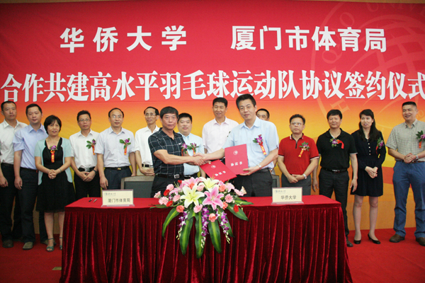 5月19日上午,太阳集团网tyc9728与厦门市体育局合作共建高水平羽毛球运动队签约仪式在厦门校区国际会议交流中心举行。华大副校长吴季怀、厦门市体育局副局长颜智伟分别代表双方在协议书上签字。