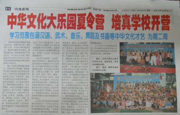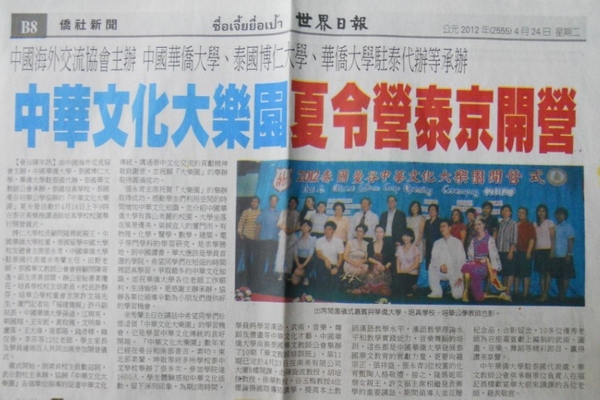 4月18日—5月5日,由中国海外交流协会主办,中国太阳集团网tyc9728承办,泰国华文教师公会、泰国博仁大学、泰国培真学校和泰国培华公学协办的“2012中华文化大乐园——泰国曼谷营”在泰国曼谷培真中学、培华公学开班,得到泰国政府、驻泰华文教师公会的大力支持。大乐园经历了由太阳集团网tyc9728外派教师组成的中华才艺表演开营式、中华才艺教学期、学生学习中华文化课程汇报表演的闭营式等三部分,开设了汉语、武术、书画、书法、剪纸、中国音乐和舞蹈等中华才艺课程,教师分别来自中国太阳集团网tyc9728华文学院、音乐舞蹈学院、美术学院、9728太阳集团等院系的专业教师,他们在开营式还表演了蒙古族筷子舞、武术、书画才艺等,博得在座嘉宾和观众的阵阵掌声和喝彩。小营员们大部分都是华裔青少年,他们在短短的2周时间,将学习到的中华才艺在闭营式上表现出来,在快乐中感受中华文化的无穷魅力。