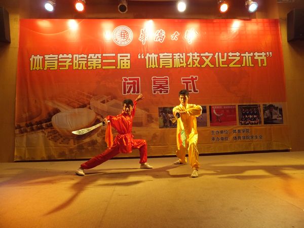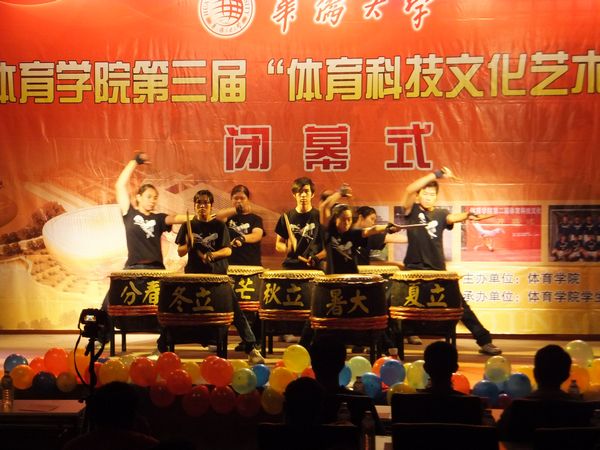闭幕式前,大屏幕上滚动展示了整个文化节活动的精彩图片。闭幕式在二十四节令鼓的恢弘气势中开场。陈壮荔副院长致辞,高度评价了第三届体育科技文化艺术节取得的成绩;学生会主席彭振福在发言中简要总结了活动的内容和目的。随后,同学们表演了精彩的武术小套路、太极拳、健美操和搏击操等。节目间隙,领导和嘉宾为获得篮球赛、足球赛、素质拓展大赛的选手颁发了荣誉证书和奖品。